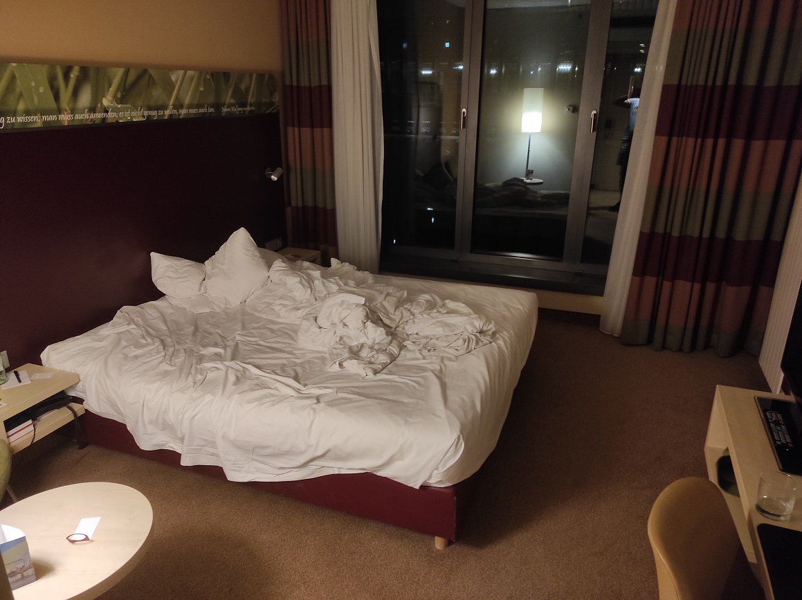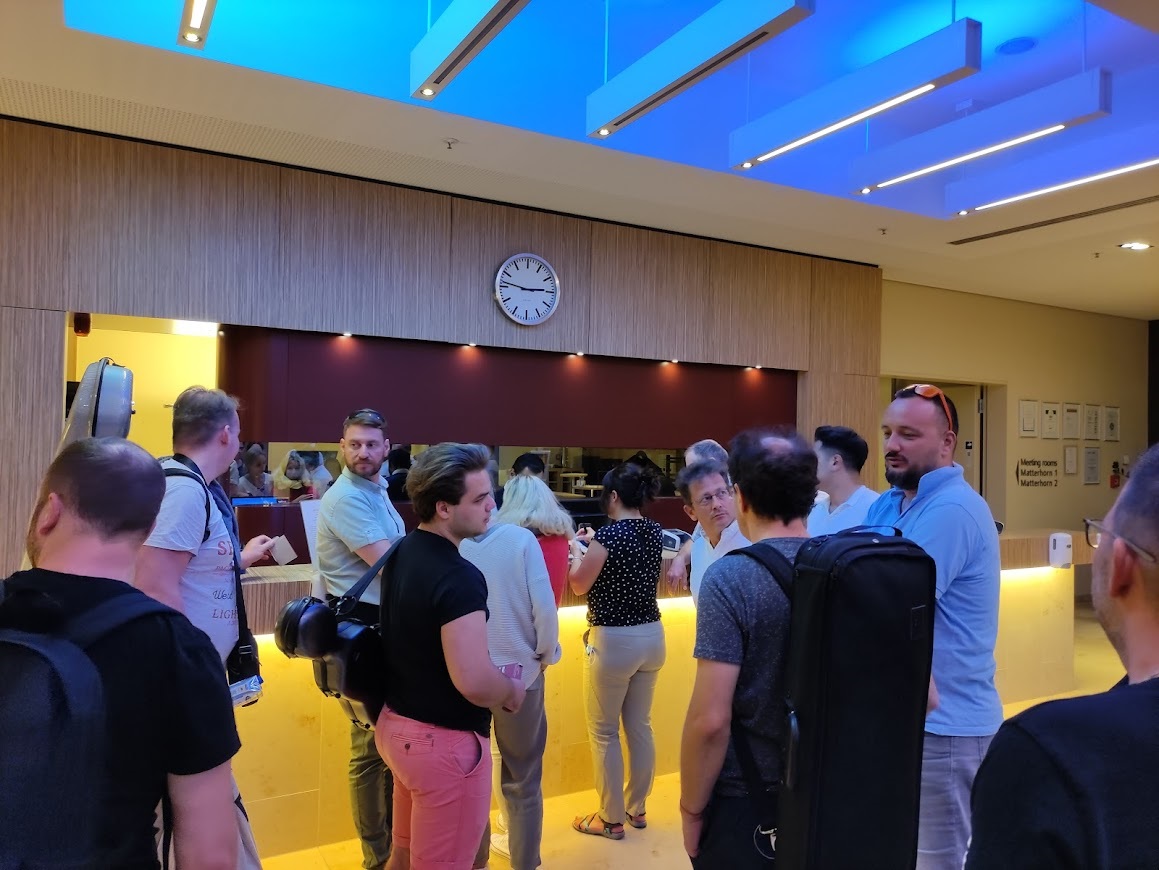 Nem említjük itt meg a szálloda nevét, ahol az egyszemélyes recepciós-mindenes kezdi meg a szobakiosztást, egy ideig lassan, de azért rendben zajlik a dolog, aztán az egyik fúvós kolléga érkezik vissza, és fanyar mosollyal közli: hát az ő ágyában már fekszik egy vendég. Na itt elszabadul a feszültségoldó nevetés, már a rekeszizmát fogja mindenki, jó, itt ma nem lesz alvás. Aztán sorban jönnek vissza a zenészek, a kiadott szoba nincs kitakarítva. Marad az előtér, a kanapék, erre-arra dölnek le az emberek, már nem vágyunk másra, csak legalább egy zuhanyzásra.