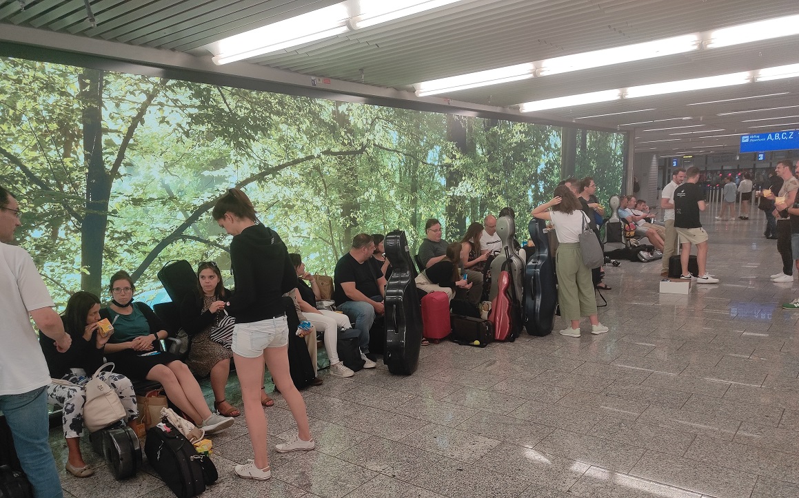 Az igazi közönségsiker, a remek fesztiválélmény után vasárnap délután jó hangulatú zenészekkel indult el a két fesztiválbusz Frankfurt felé. A reptérre érkezéskor optimistán néztük az információs táblát: hurrá, már ott a beléptető kapu száma, nincs késés jelzés, ez csak jobb lehet, mint az ide út (Akkor majd háromórás késéssel indultunk). Átestünk szépen a protokoll szerinti beléptetési kellemetlenségeken, csak a csellista kollégákra várt hosszabb procedúra a fedélzetre szánt hangszerekkel, a csomagjaink már a furgonnal hazaértek, a nem reptethető hangszerekkel együtt.