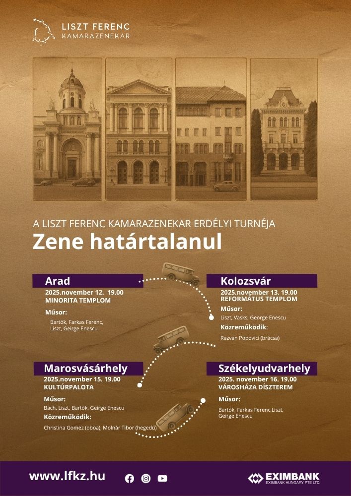 Nagy öröm számunkra, hogy az EXIMBANK támogatásával immár második éve valósíthatjuk meg erdélyi turnénkat. A 2024-es koncertjeink – Szatmárnémetiben, Nagybányán, Kolozsváron és Nagyváradon – telt házas sikert arattak, és felejthetetlen találkozásokkal ajándékoztak meg minket.